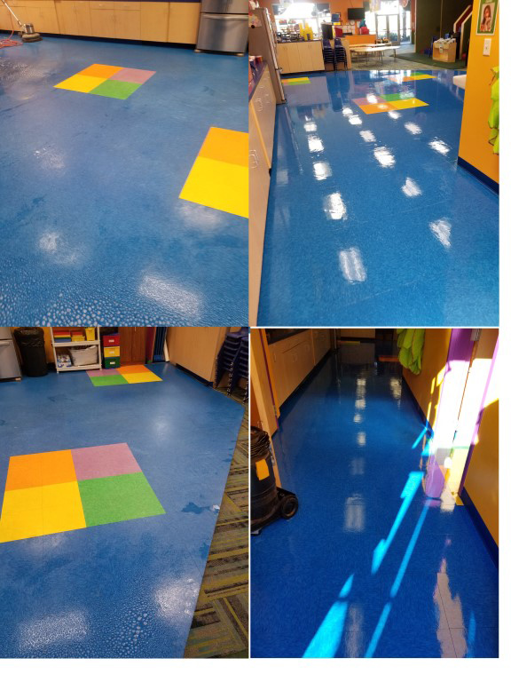 Our professional VCT (Vinyl Composition Tile) strip and wax is a multi-step process to deeply clean, restore, and protect commercial and residential floors, involving chemically stripping old wax/grime, neutralizing the tile, applying several coats of a durable wax for a high shine that protects and extends floor life and appearance.